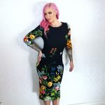 This gorgeous pencil dress fits true to size and does have some stretch in it. It has a zip opening at the back. Jodie is a size 10 and wears a size 10. Jodie is 5’2.